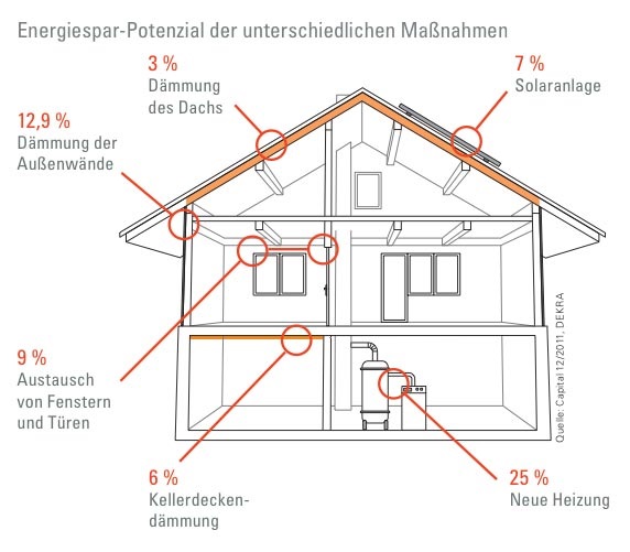 Lediglich eine neue Heizung in Kombination mit einer Solaranlage und auch die Dämmung der Kellerdecke sind lohnenswert. Allein die neue Heizungsanlage amortisiert sich durch die Brennstoffersparnis bereits nach sechs Jahren.